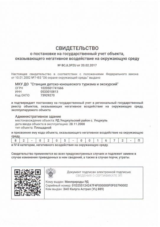 свидетельство о постановке на государственный учет объекта оказывающего негативное воздействие на окружающую среду (скачать) (посмотреть)